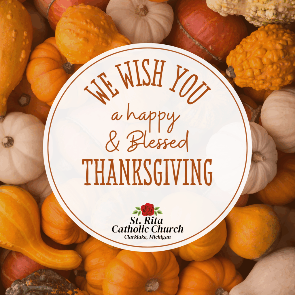 Happy Thanksgiving from the St. Rita Staff! Our office will be closed on Thursday and Friday for the holiday. Mass will be at 9 AM on Thanksgiving Day.